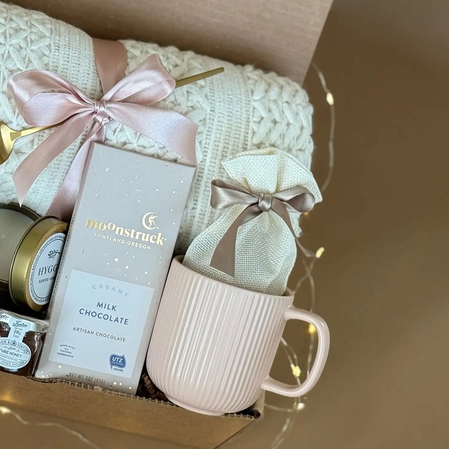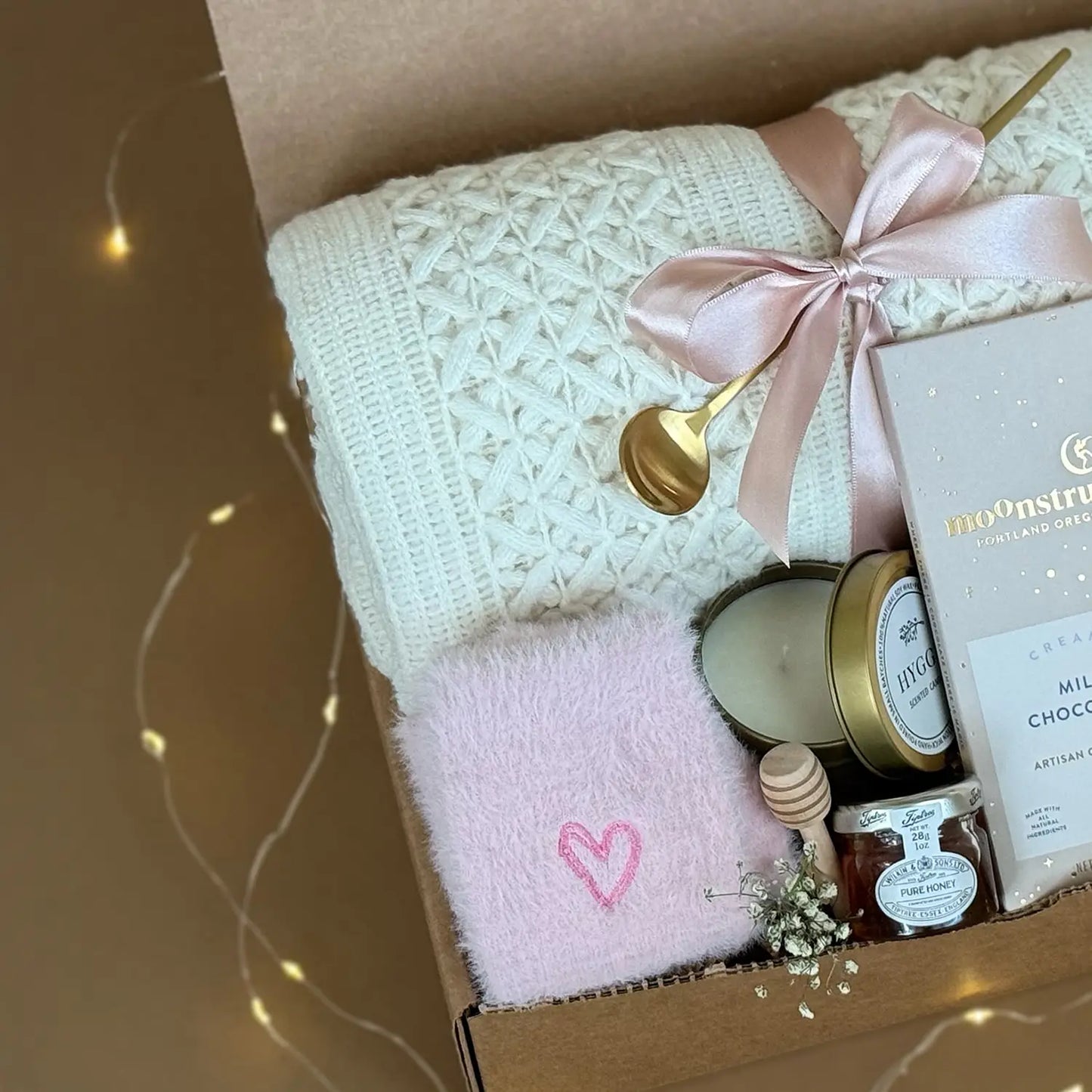 Wrap them in warmth with this Cozy Care Package! Includes a soft 50x60" blanket, a 12 oz ceramic mug, heart-patterned socks, vanilla candle, herbal tea, milk chocolate, honey with a dipper, and a gold spoon—perfect for relaxation
