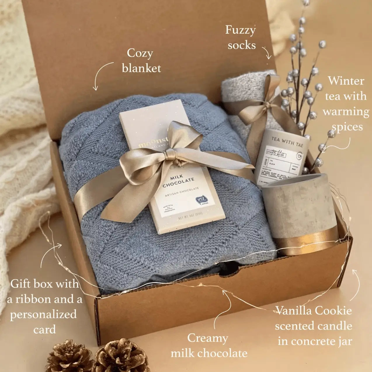 Every gift is unique and packed by hand specifically for you. Please refer to the product page to see more details about each hygge box. You might experience slight variations in ornaments, colors, or packaging. If you have any special requests, just reach out. We would be happy to hear from you!