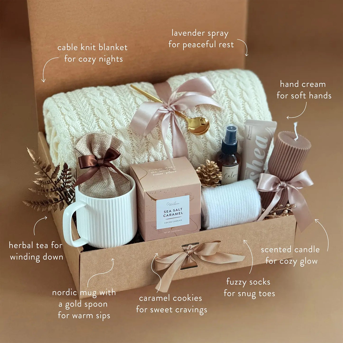 Discover the magic of autumn with the Chill Charm Fall Gift Basket, a thoughtfully curated collection designed to bring comfort, relaxation, and joy. Perfect for crisp evenings, quiet mornings, or thoughtful gifting, this box blends cozy textures, sweet indulgences, and soothing aromas to create a seasonal sanctuary.