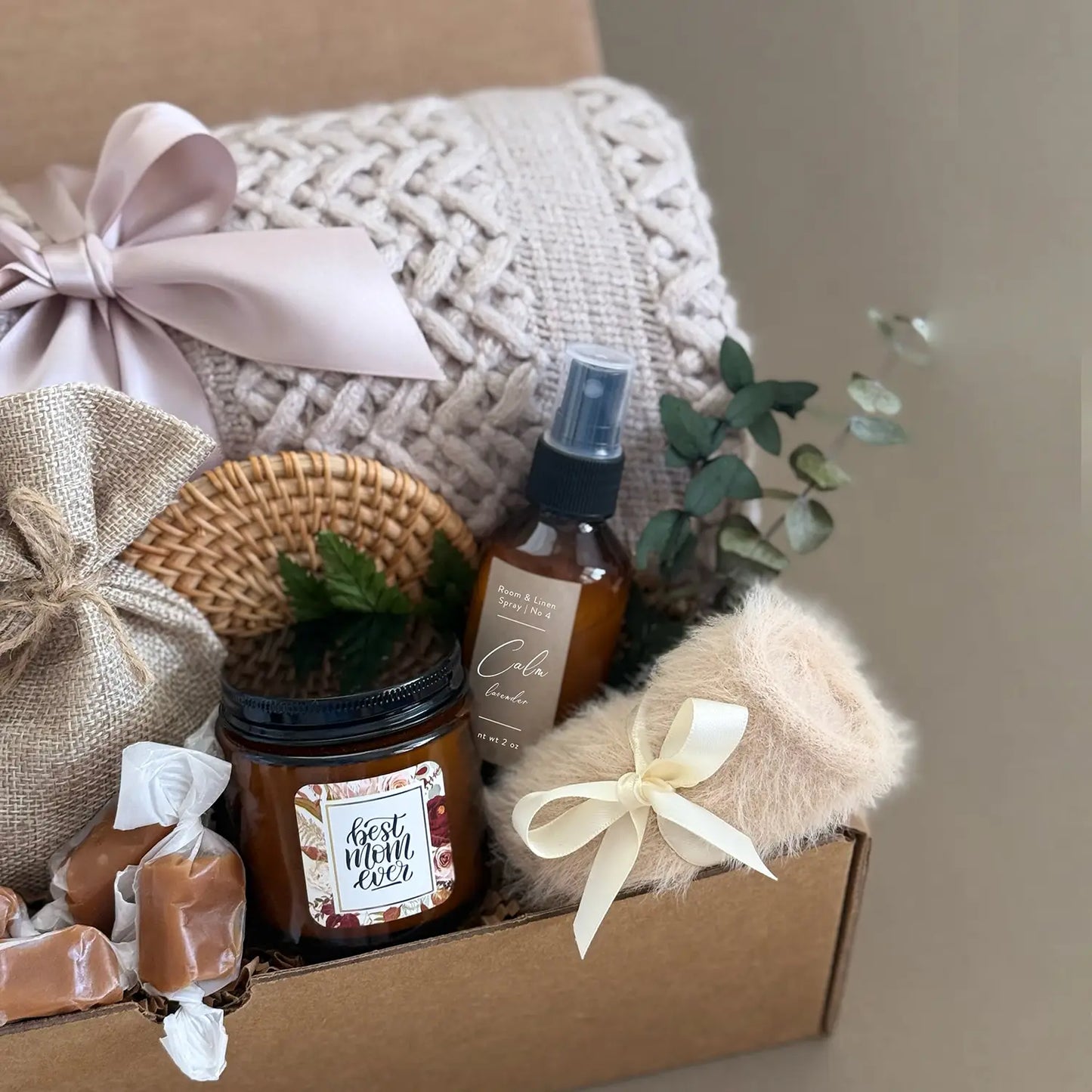 Pamper her with this cozy gift: a soft blanket, fluffy socks, scented candle, soothing tea, caramels, a āBest Everā mug or ceramic mug with Heart ornament, nourishing hand cream, linen spray, and a stylish rattan coaster.
