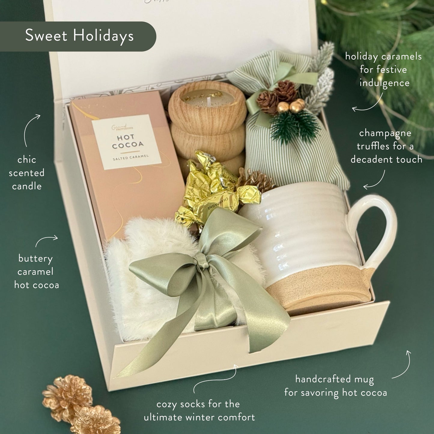 Wrap yourself in cozy comfort with the Sweet Holiday Gift Box — a beautifully curated holiday set that combines soft textures, warm flavors, and elegant seasonal charm. Designed to inspire relaxation and joy, this box includes a handcrafted ceramic mug, a bar of salted caramel hot cocoa, a cloth bag of buttery holiday caramels, and golden champagne truffles. A plush pair of faux-fur socks and a natural wood candle complete the experience, creating a perfect moment of hygge-inspired calm. Thoughtfully finished with satin ribbon and festive greenery, it’s a gift that radiates comfort, sweetness, and quiet luxury.