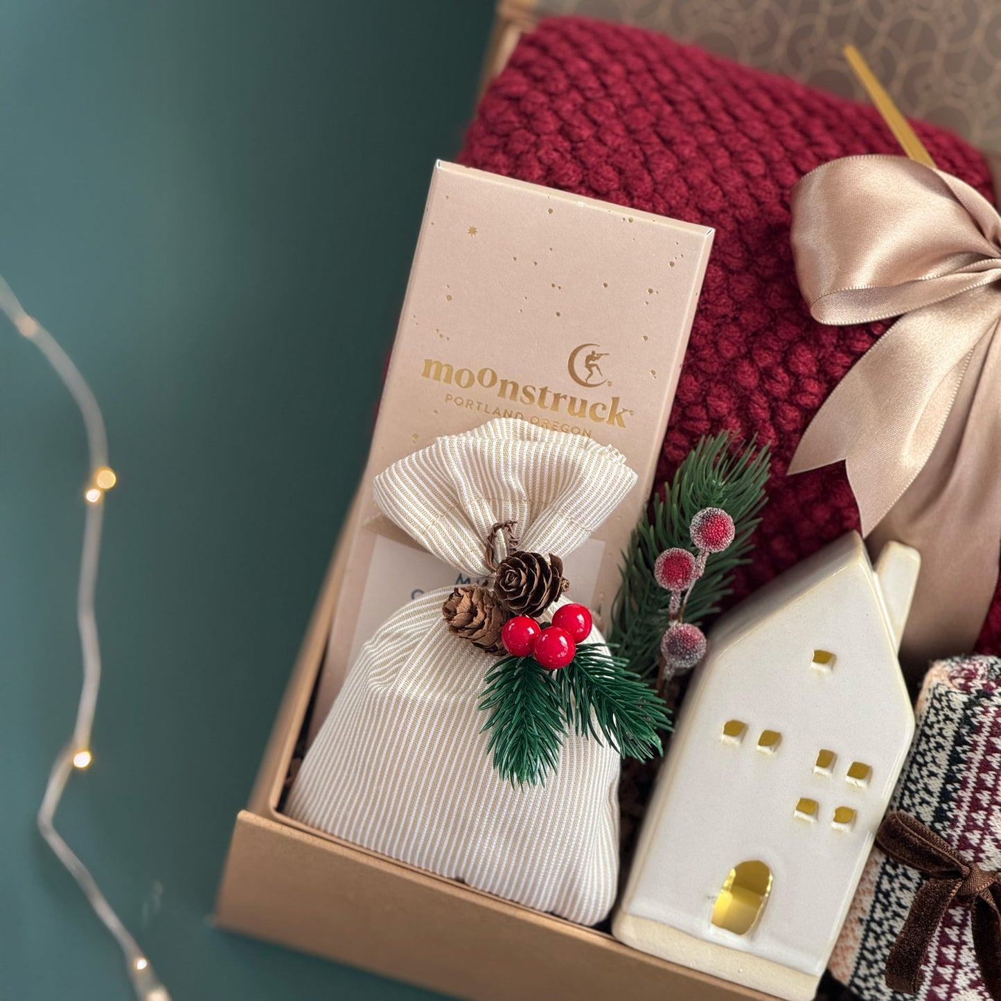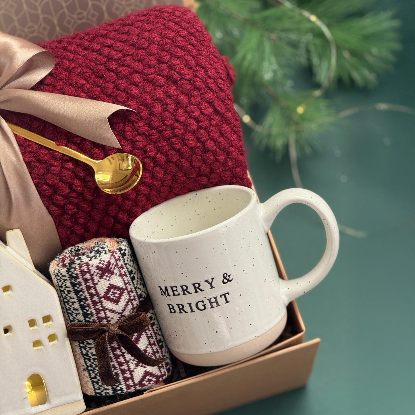 Celebrate the joyful spirit of the holidays with the Merry & Bright Gift Box — a cozy and elegant collection designed to bring warmth, sweetness, and cheer. Wrapped in deep red and golden tones, this festive set includes a soft textured throw, a ceramic “Merry & Bright” mug, a bar of creamy artisan chocolate, and a bag of soothing herbal tea. A gold stirring spoon and a ceramic house candle holder add touches of glow and charm, while patterned winter socks complete the cozy ensemble. Beautifully finished with satin ribbon and natural greenery, this gift box captures the essence of hygge-inspired holiday comfort.