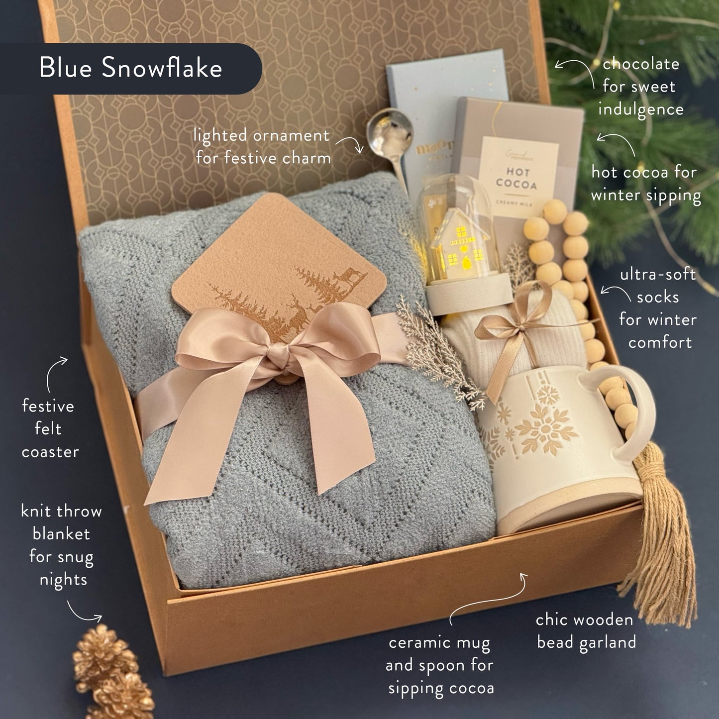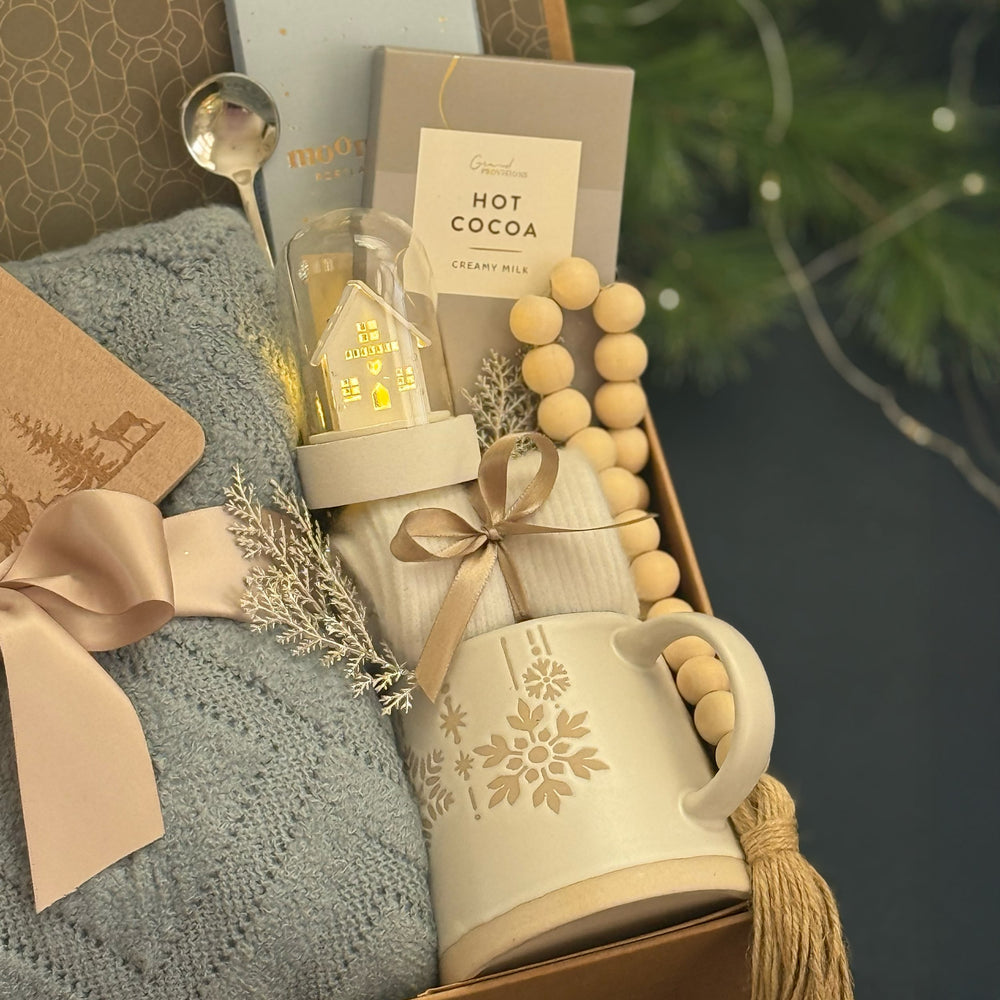 Embrace the cozy calm of the season with the Blue Snowflake  Box — a beautifully curated winter collection that blends soft textures, golden details, and festive charm. Designed for warmth and relaxation, this elegant set includes creamy hot cocoa, artisan milk chocolate, and a snowflake mug for the perfect fireside treat. A plush knit throw and cozy socks add luxurious comfort, while a glowing house light, wooden bead garland, and felt reindeer coaster complete the serene holiday aesthetic. Wrapped with satin ribbon and pine accents, it’s a thoughtful gift that captures the quiet glow of winter moments.