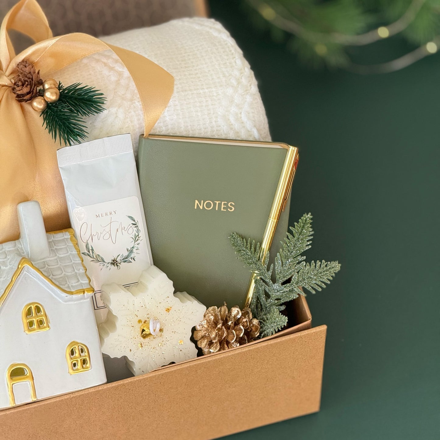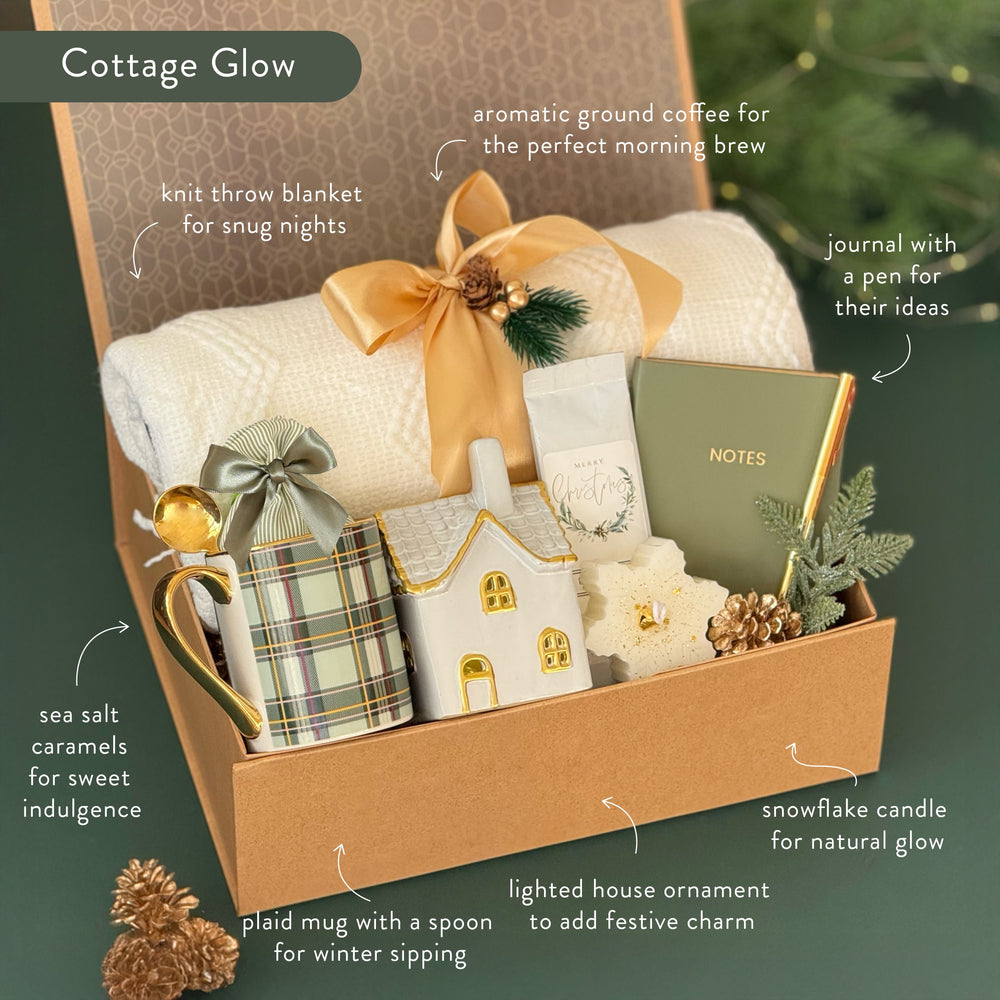 Celebrate the magic of the season with the Cottage Glow Gift Box — a beautifully curated collection that brings warmth, sweetness, and timeless holiday charm. This cozy set features a soft winter throw, a plaid ceramic mug with a gold spoon, artisan holiday caramels, and a glowing ceramic house for festive ambiance. Paired with a soothing candle, premium coffee, and a chic journal and pen set, it’s the perfect balance of comfort and sophistication. Designed for cozy mornings, peaceful evenings, and joyful moments of reflection, this box makes every winter day feel special.