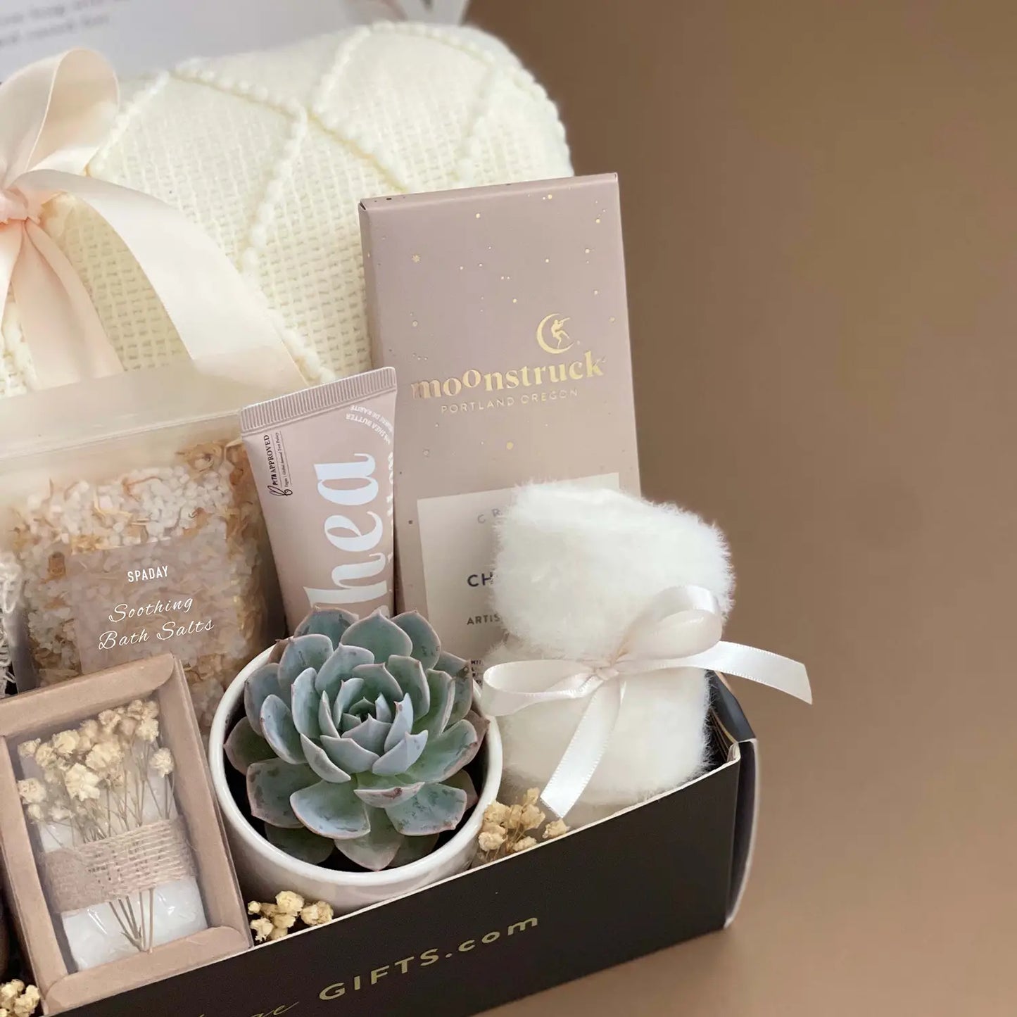 Bring the warmth and relaxation of autumn into her home with this cozy fall gift basket. Thoughtfully designed for the ultimate hygge experience, this set features a soft throw blanket, a vibrant succulent to add a natural touch, soothing Himalayan bath salts, and other fall mood essentials. Perfect for unwinding after a long day, this gift is ideal for her fall birthday, self-care rituals, or as a seasonal surprise.