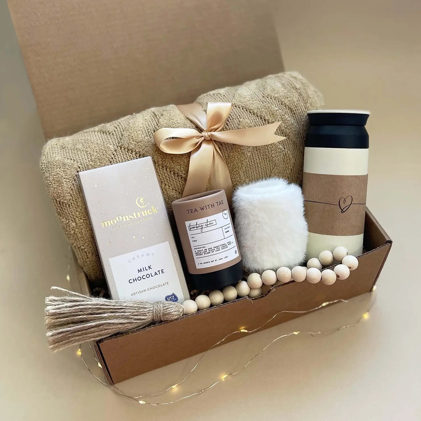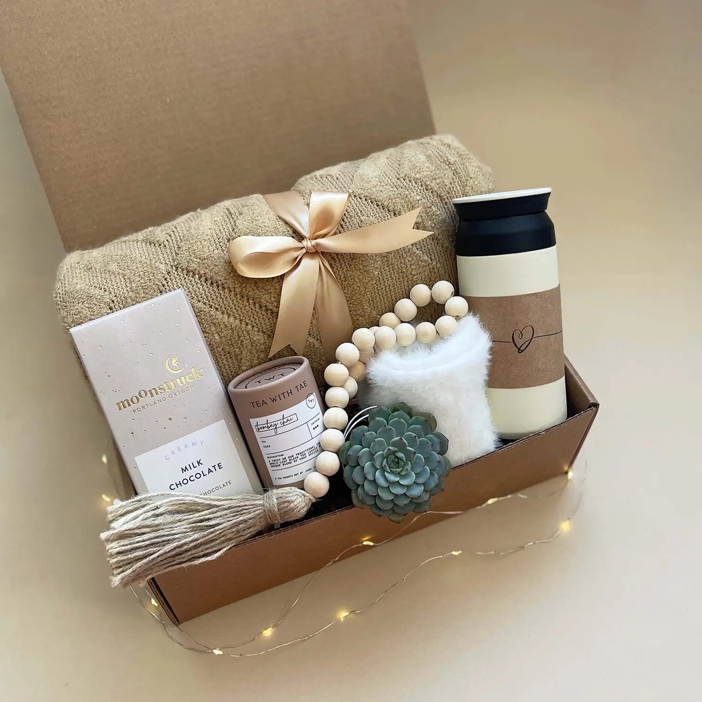 Introducing the ultimate comfort care package for any occasion from Happy Hygge Gifts! Our carefully curated gift basket is designed to bring a sense of Hygge and warmth to your loved ones. It features a cozy blanket and snug socks, perfect for snuggling up during recovery or hard times. The tumbler is there to keep their favorite tea warm, providing a soothing and comforting experience. Indulge their sweet tooth with decadent chocolates, guaranteed to lift their spirits. And last but not least, a resilient succulent that symbolizes growth and resilience during challenging times.